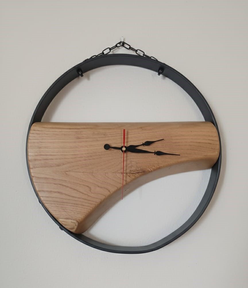 Questo orologio rotondo in legno chiaro e bordo in metallo nero unisce tradizione e modernità, con un design semplice che mette in risalto la qualità artigianale e la finitura liscia.